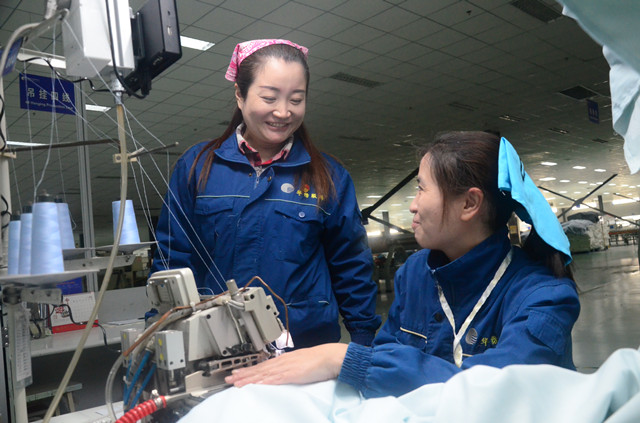 圖為姚俊燕(左)在與五線縫紉工王冬梅交流新貨單操作要點