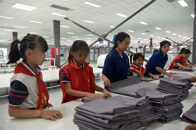 導讀:9月23日,濱城區玉龍湖小學四年級學生在老師帶領下走進公司,實地參觀了公司的生產車間以及部分展廳,現場體驗了家紡產品驗整及包裝等生產環節,感受勞動的艱辛與快樂。